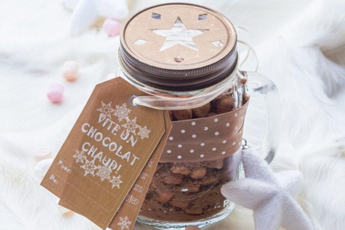 N'oubliez pas d'ajouter une étiquette avec les instructions : "Pour un chocolat chaud, mélangez 4 cuillères à soupe avec un mug de lait bien chaud et savourez !"