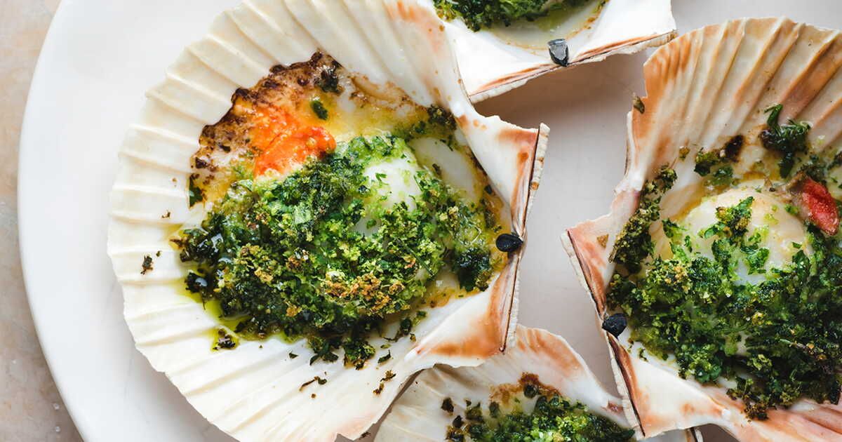Pour cette recette, commencez par faire fondre 333 g de beurre pommade. Versez-le dans un mixeur ou un Thermomix avec trois bottes de persil frais, 20 g d’estragon, 5 g de thym, un oignon nouveau haché, 30 g d’ail, 100 g de croûtons, 15 g de sel, 2 g de piments, le zeste de deux citrons jaunes, 2 g de poivre et 50 g de moutarde à l’ancienne. Mixez jusqu'à obtenir une consistance lisse avant d'incorporer progressivement le reste du beurre pour créer un beurre d'escargot. Déposez une cuillère généreuse de ce mélange sur chaque Saint-Jacques, posées sur leur coquille. Faites cuire ces dernières sur des braises jusqu'à ce que le beurre devienne doré, en environ trois à quatre minutes. Servez avec une belle tranche de pain de campagne. Si vous préférez, vous pouvez également les cuire au four.