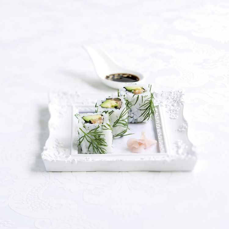 - Rouler le california : Enroulez délicatement la feuille de nori autour du mélange en veillant à ce que les bords se rejoignent. Saupoudrez d'aneth pour ajouter une touche aromatique. Utilisez un maki su pour bien former votre rouleau, puis coupez-le en six morceaux égaux avec un couteau humide.