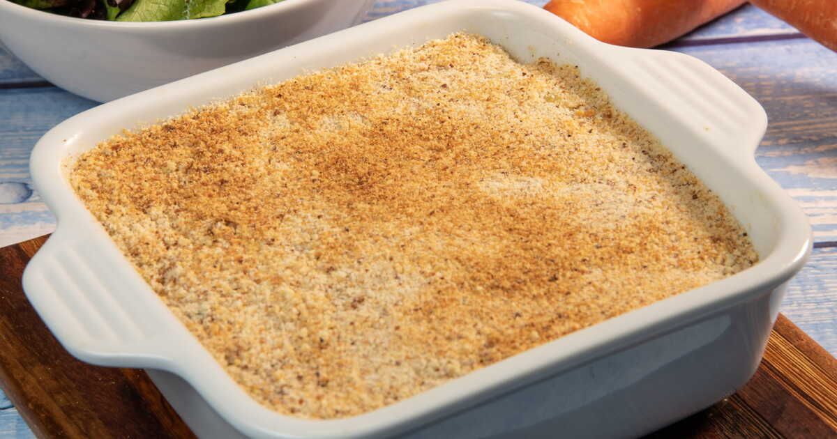 - Mettez le mélange dans un plat à gratin, saupoudrez de chapelure et ajoutez quelques noisettes de beurre.