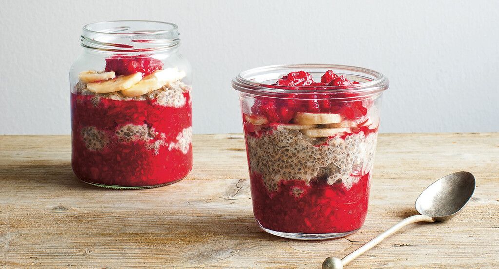 Pour servir, disposez une portion de la compote de framboises dans un bol, ajoutez le porridge de chia par-dessus, et garnissez de rondelles de banane. Terminez en ajoutant le reste de la compote pour un mélange savoureux.